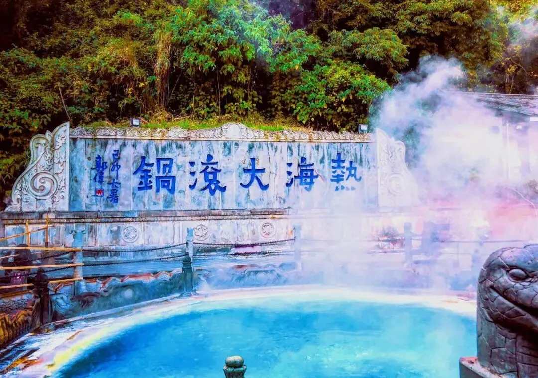 热海风景区的“大滚锅”常年沸腾,温泉水温高达97℃,游客可体验“云南十八怪”中的“鸡蛋串着卖”。