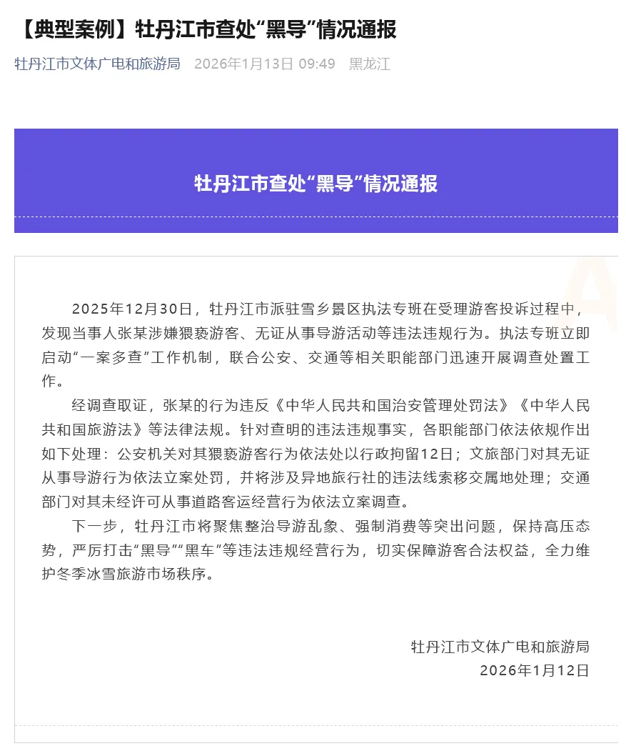 1月13日,牡丹江市文体广电和旅游局发布情况通报:
