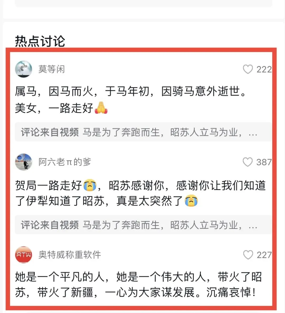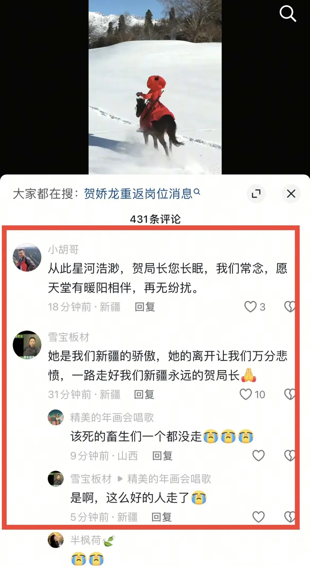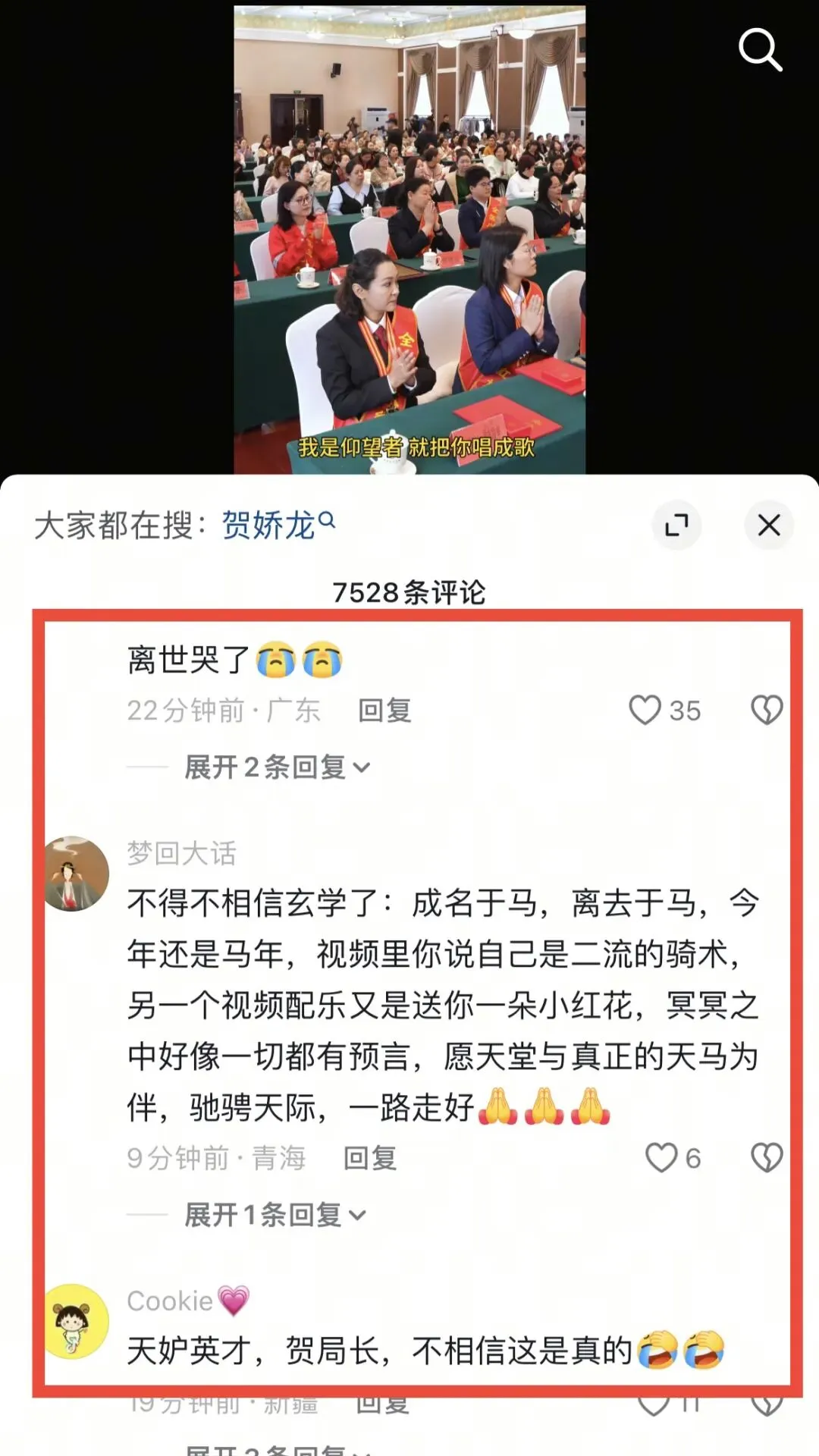 网友说:贺娇龙成名于马,离去于马,今年还是马年,视频里你说自己是二流的骑术,另一个视频配乐 ,又是送你一朵小红花,冥冥之中好像一切都有预言,愿天堂与真正的天马为伴,驰骋天际,一路走好。