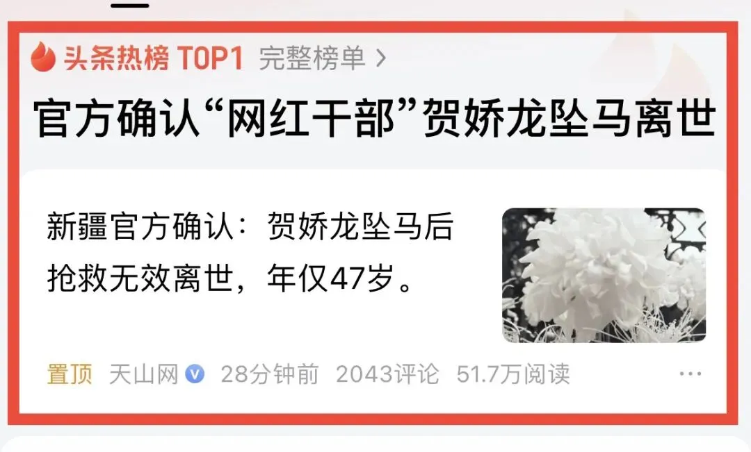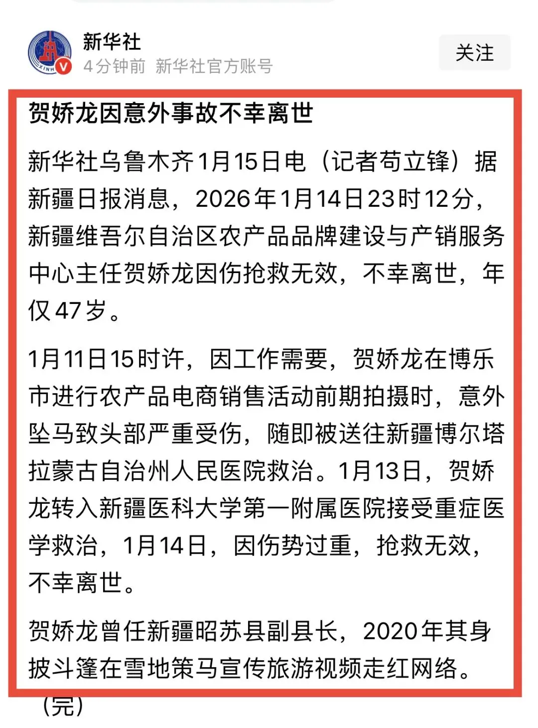 2026年贺娇龙刚好47岁,正是人生事业上升期,可惜天妒英才,根据(央视新闻)(新华社)消息,2026年1月11日,贺娇龙在新疆博乐调研,进行农产品电商销售前期拍摄工作时,意外坠马,头部受伤严重,在新疆医科大学第一附属医院经抢救无效,于2026年1月14日23时不幸离世,一路走好。