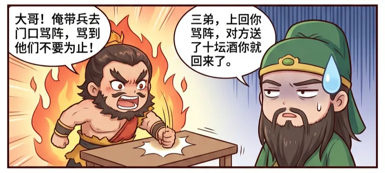 三弟张飞率先献策:“大哥!俺带兵去门口骂阵,骂到他们不要为止!”典型的“情绪驱动型”解决方案,图一时口快,却无实际策略。二哥关羽立刻无情揭短:“三弟,上回你骂阵,对方送了十坛酒你就回来了。”讽刺拉满:本想施加压力,反被对方“糖衣炮弹”轻松化解。张飞像极了生活中一言不合就放狠话,却极易被小恩小惠安抚的直性子。