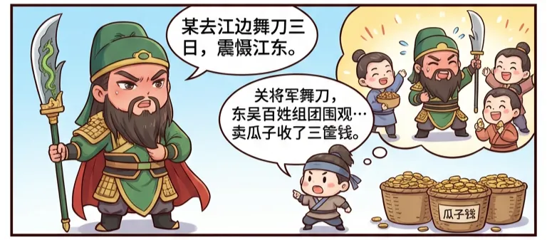 关羽则选择另一种路线:“某去江边舞刀三日,震慑江东。”结果更富戏剧性——探子来报:“关将军舞刀,东吴百姓组团围观…卖瓜子收了三筐钱。”本想展示肌肉进行威慑,不料却被对方群众当成“收费表演”围观,甚至拉动了地方消费。这揭示了现实的一大陷阱: 当你试图用单纯的实力炫耀来吓唬对手时,很可能低估了对方的“商业化解读”能力,最终让自己成了笑话。