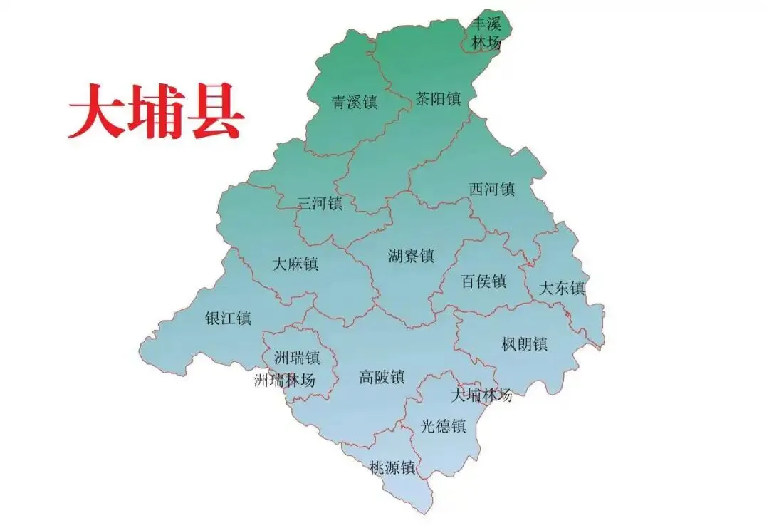 大埔县辖14个镇:湖寮镇、茶阳镇、西河镇、百侯镇、枫朗镇、光德镇、桃源镇、高陂镇、大麻镇、三河镇、大东镇、洲瑞镇、银江镇、青溪镇,另有3个林场:丰溪林场、洲瑞林场、大埔林场。县政府驻地湖寮镇。
