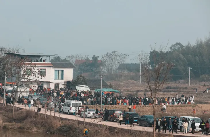 这毫无修饰的真诚,瞬间击穿了网络世界的重围。视频发布24小时内,获44万点赞、27万转发,七个500人微信群爆满,超3000人报名。1月11日当天,上千网民从四面八方涌入重庆合川的庆福村,车辆绵延数公里导致村道瘫痪。总人流量达上万人次,直播间实时在线人数逾10万。一场私人杀猪宴,演变成了万人奔赴的乡村嘉年华。