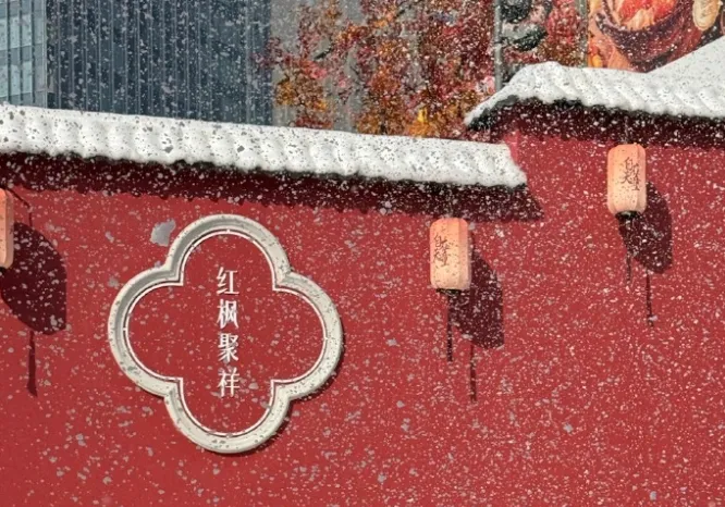 以“中国红”墙面与园林造景为特色,融入天童景区十景之一的红枫元素,并结合新中式美学,还会有人造飞雪景观,开放时间持续至2026年3月底。