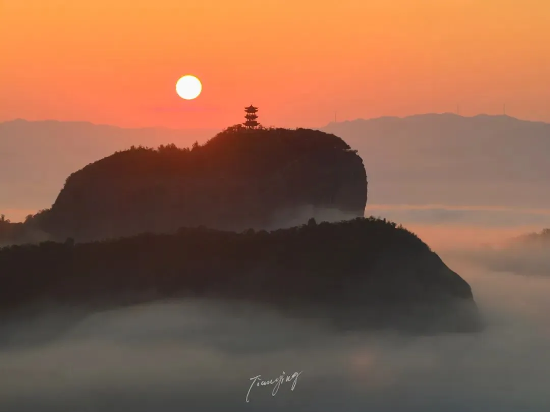 日出时刻,红日喷薄而出,把天空、云海都染成绚烂的橙红色,与巍峨山峰、古朴亭阁相映,画面震撼又治愈,仿佛天地间的美好都在此刻汇聚。