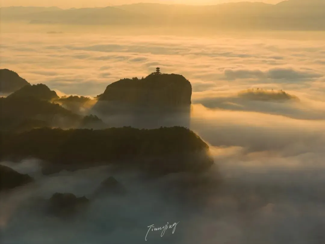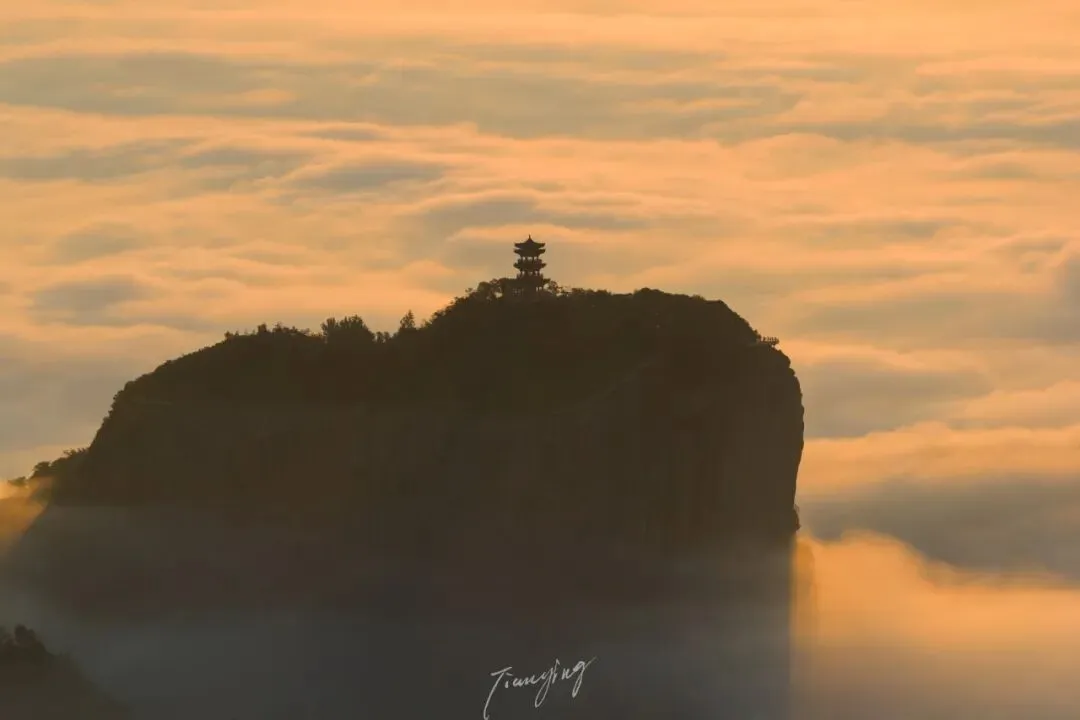 清晨,云海如海浪般翻涌,将山峰簇拥其中,山顶的亭阁在云雾里时隐时现,仿若悬浮于天际的仙阁。阳光洒落,给云海镀上暖金光泽,光影变幻间,似有神秘气息在弥漫。