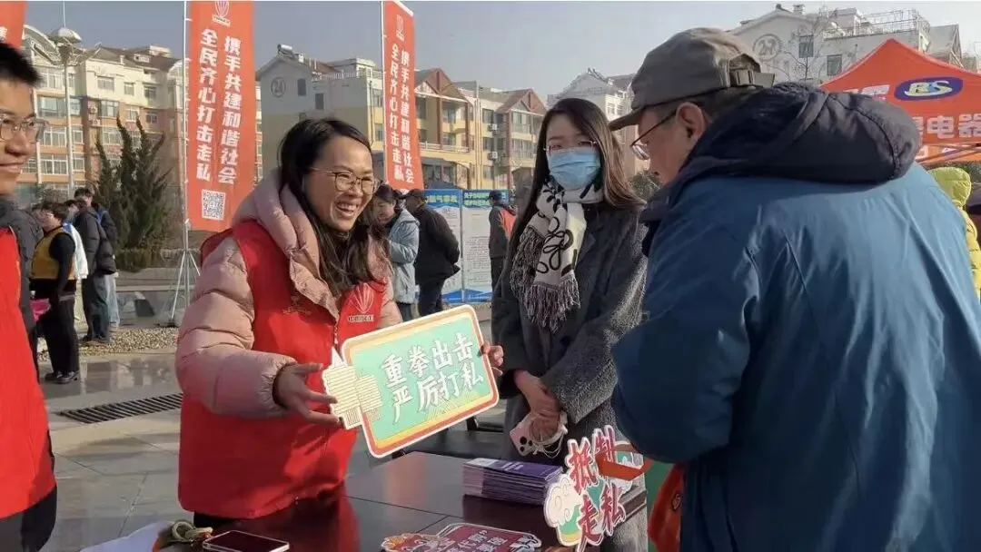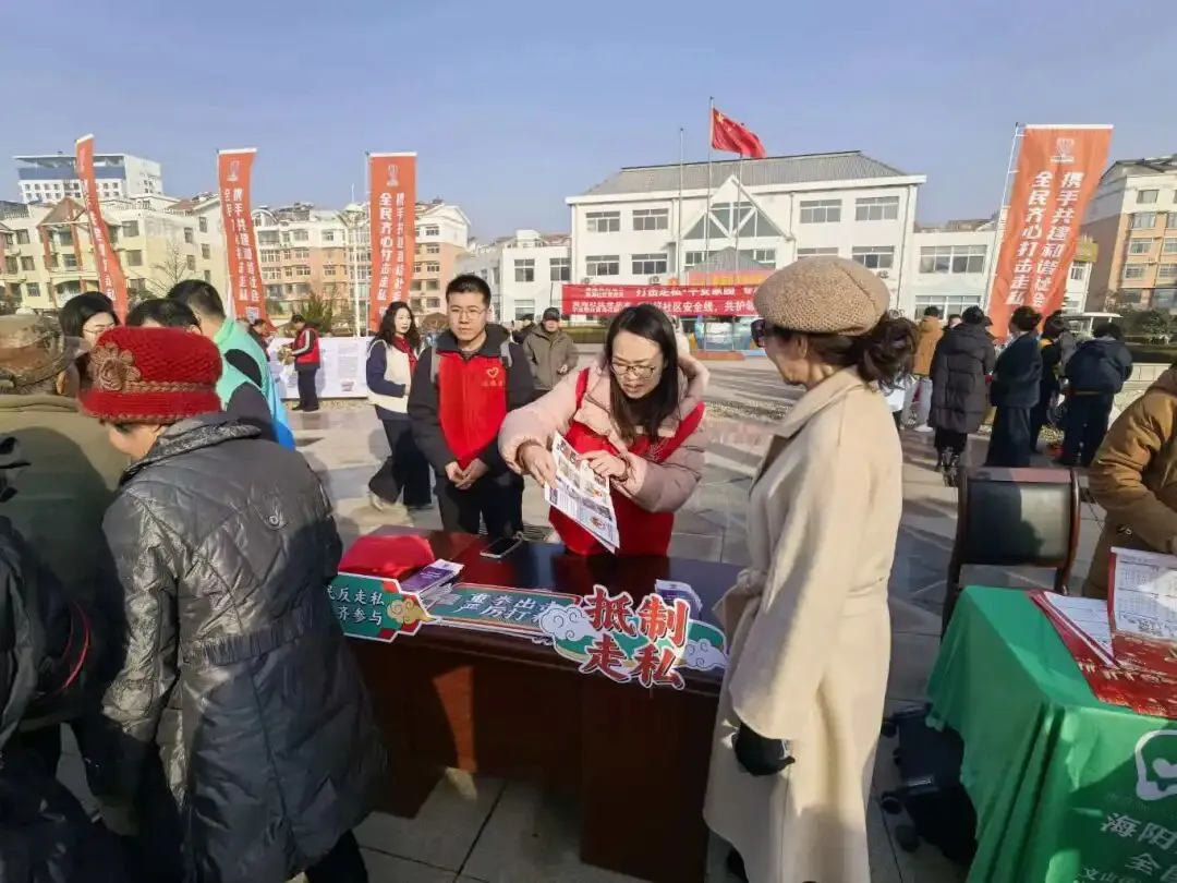 来自交通局、司法局、海阳海关、海阳边检站、烟草专卖局等单位的工作人员,通过展板展示、案例讲解、发放宣传手册等方式,向居民普及反走私法律法规、常见走私物品识别技巧及举报奖励政策。