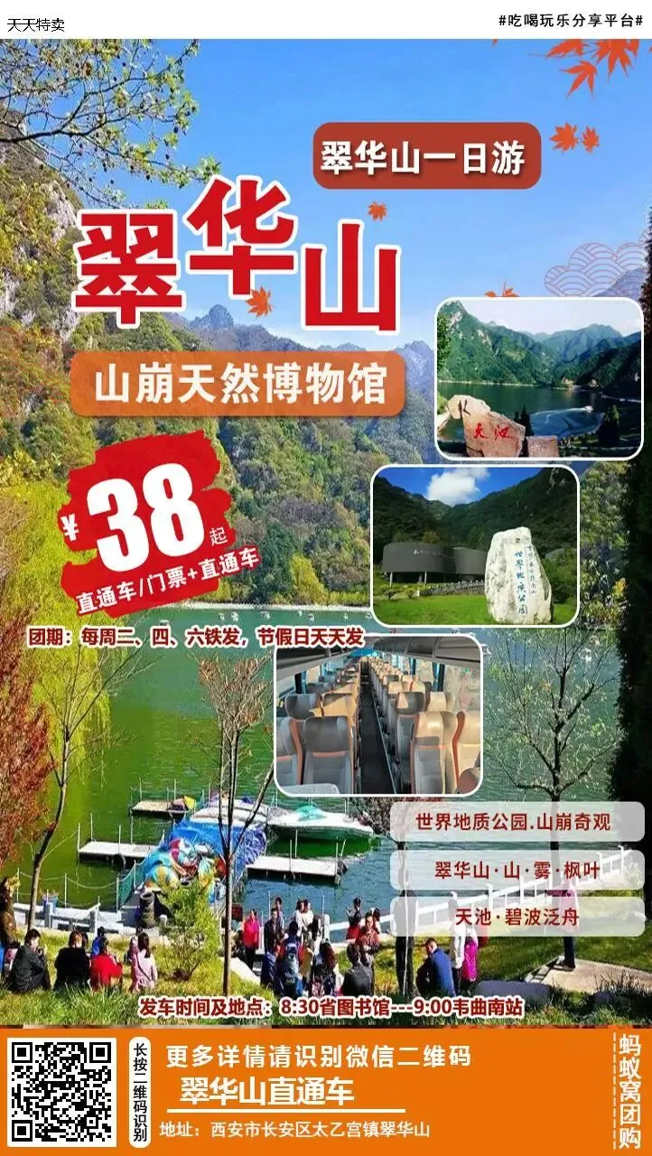 38元起抢翠华山直通车/翠华山景区门票+市区直通车门票!翠华山一日游 山崩奇观+山、雾、枫叶+碧波泛舟~每周二、四、六铁定发