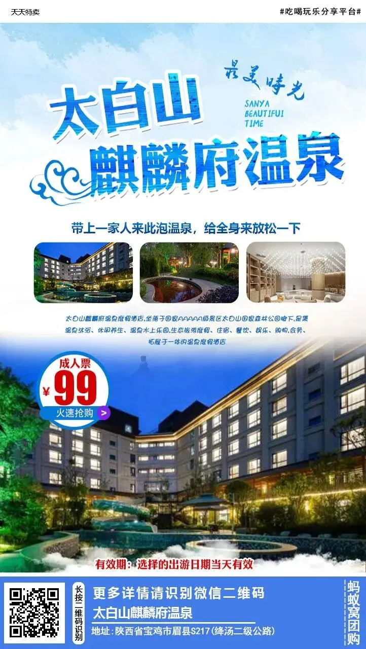 [鼓掌]99元抢198元太白山麒麟府温泉成人门票啦!