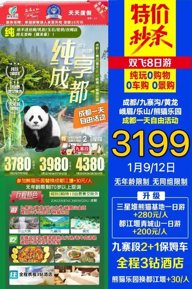 【肇东纵横旅游寒假团】1月17日秒杀纯玩成都特价8日游 最低秒杀价格