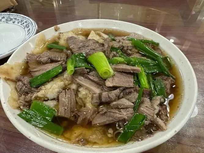 大饼撕成不规则的片儿,泡在牛肉老汤里,上头盖着切成薄片的酱牛肉。