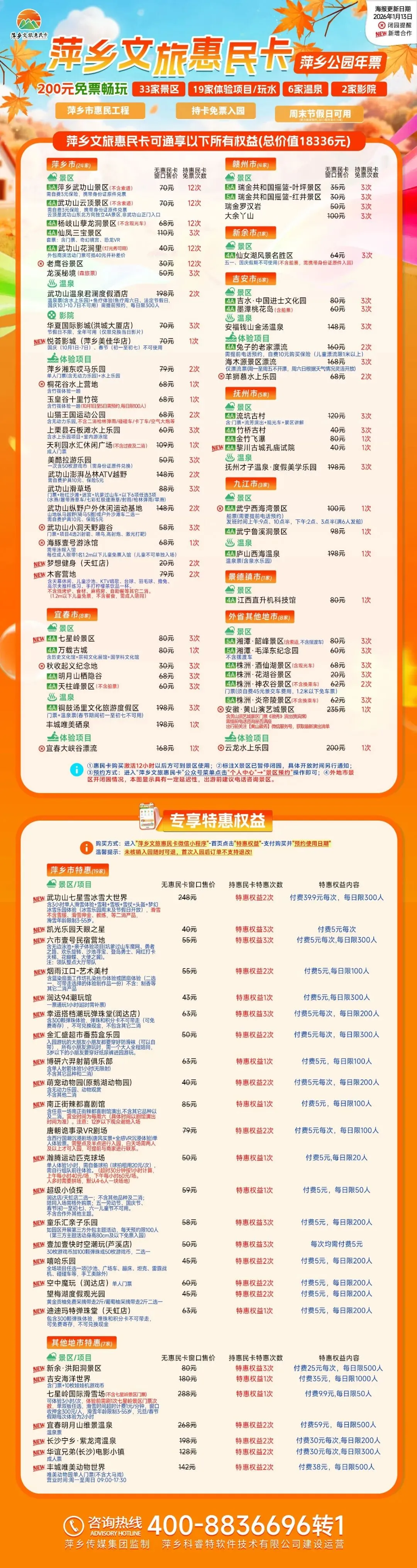 萍乡文旅惠民卡建设运营中心会根据萍乡文旅惠民卡的运营需求,不断围绕用户的体验来增加惠民卡的附加值,会持续新增更多的景区以及权益商家让用户得到更好的体验,也会根据实际运营的情况和各景区的合作签约情况进行部分合作景区的服务内容调整(含部分景区中止合作退出的情况),请知悉!