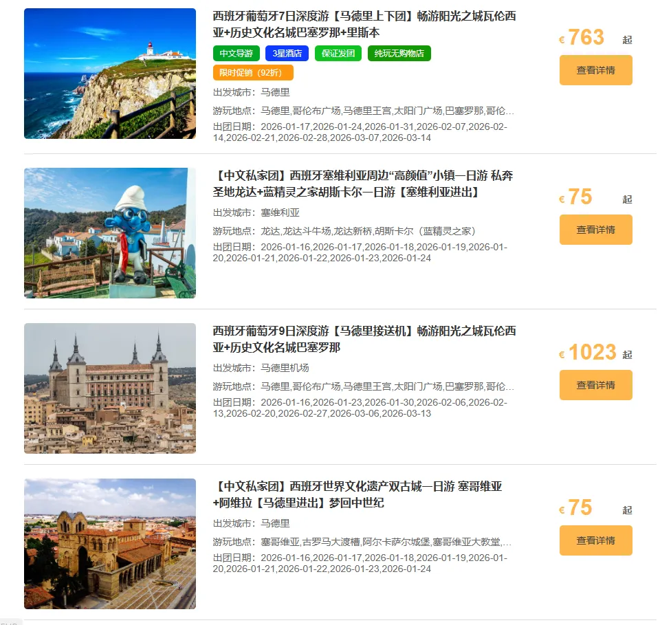 ✅②交通便捷:全程豪华旅游巴士接驳,马德里与巴塞罗那、塞维利亚等城市高效串联,省去自驾规划与换乘烦恼;马德里作为上下团点,航班通达全球,中国直航便捷衔接。