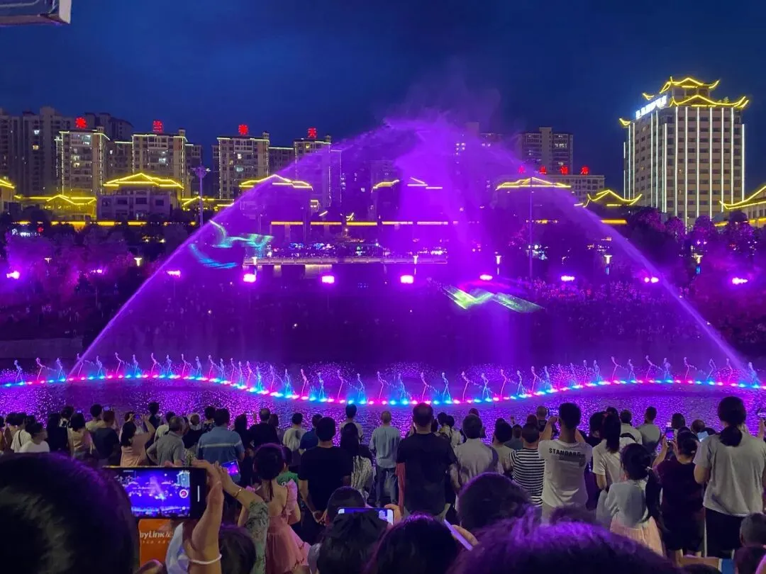 吃完美食不行3分钟即可在滨江路中断欣赏到清江河中盛大的喷泉表演,喷泉长66米,宽12米,最大喷射高度可达60米,喷泉随着音乐律动,能变幻出各种造型,如有的一柱擎天,有的翩翩起舞。同时,喷泉还配有五彩斑斓的灯光,水电声光交融,美轮美奂。播放的音乐多为当地特色民歌,如《龙船调》《黄四姐》等,带来不一样震撼的视觉和听觉盛宴。
