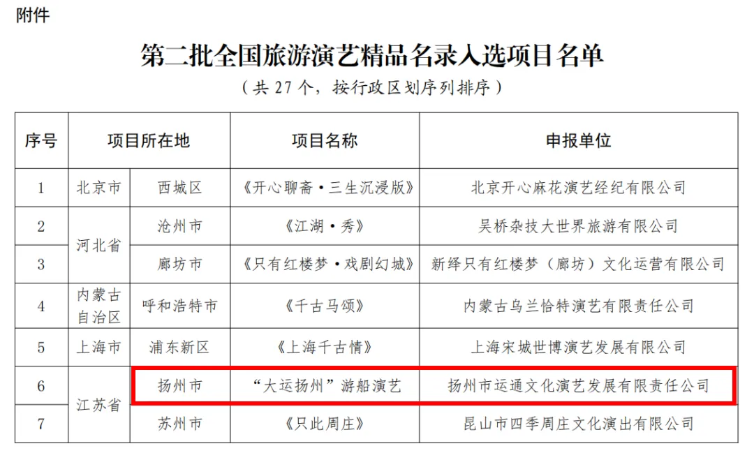 刚刚(1月15日),文化和旅游部传来捷报!“大运扬州”古运河行进式游船演艺项目,以省内排名第一的成绩在全国150个参评项目中脱颖而出,成为全国27个入选精品项目之一,成功入选第二批全国旅游演艺精品名录!