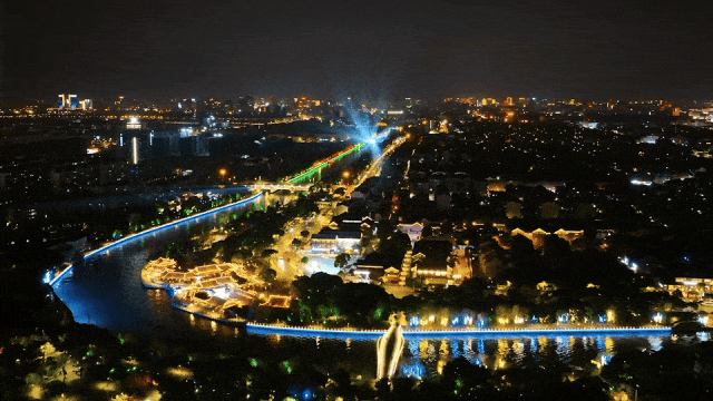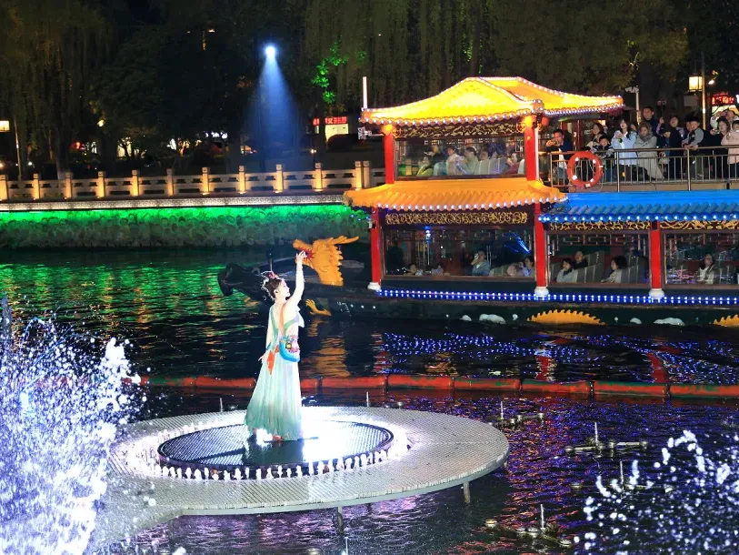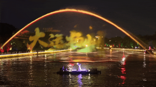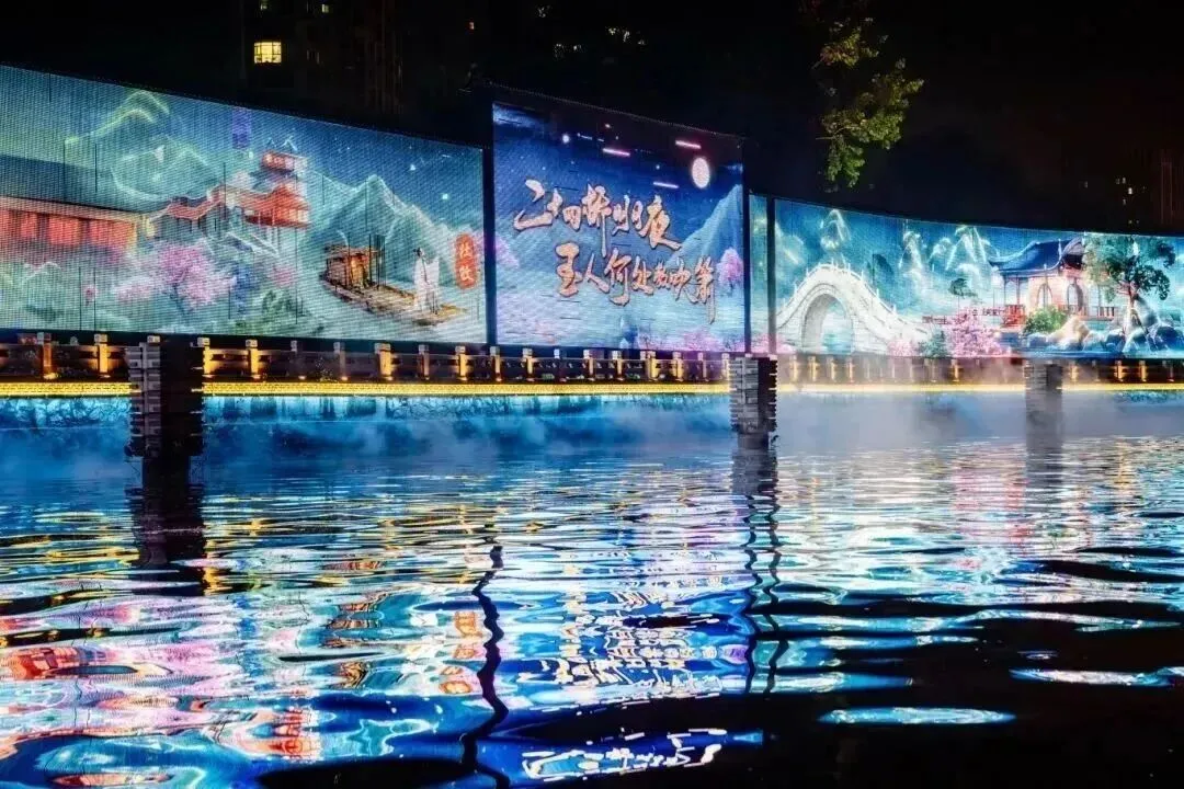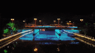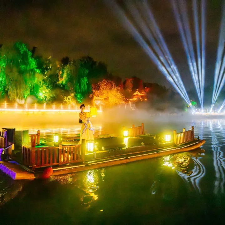 项目首创 “行进式游船 + 岸线光影科技 + 实景演艺” 三位一体模式,打造独具特色的流动文旅盛宴。游客乘坐定制的 “大运扬州” 号游艇,在饱览升级后的滨河亮化景观之余,沉浸式体验两岸由全息水幕、三维动画、特效装置交织而成的动态光影画卷;配合伴游船上真人演员的实景演出,光影叙事与实景演绎浑然一体,让游客从 “旁观者” 转变为 “参与者”,深度融入跨越千年的文化剧情之中。