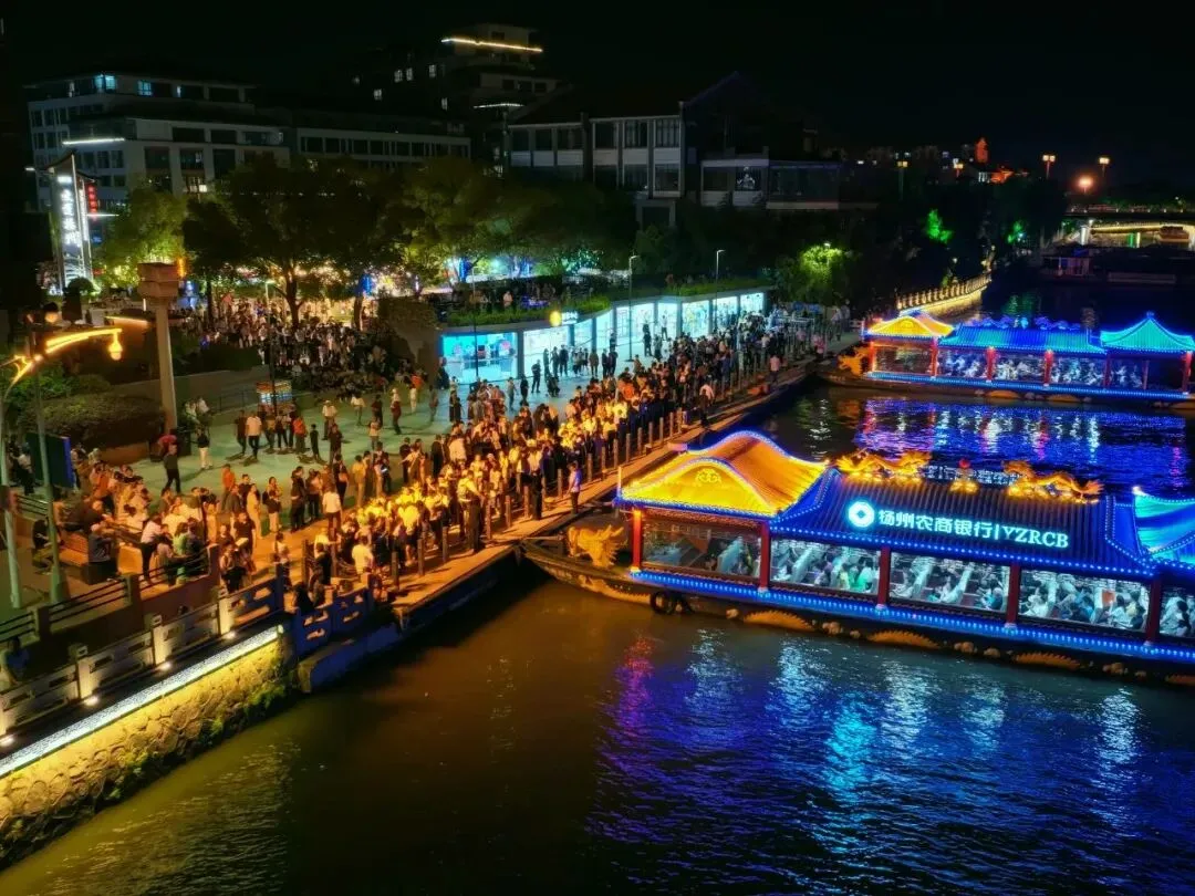 同时,项目以核心水上游览线为依托,同步推进沿线码头服务功能提升,拓展岸上消费场景,打造麦粉厂大楼 3D 光影秀,引入河岸市集、非遗展演、文创展销等业态,开发 “大运扬州” 系列文创产品,构建起水岸联动、消费闭环的全链条文旅体验空间,有效延长游客停留时间,全方位提升文旅消费体验与深度目的地感知体验。