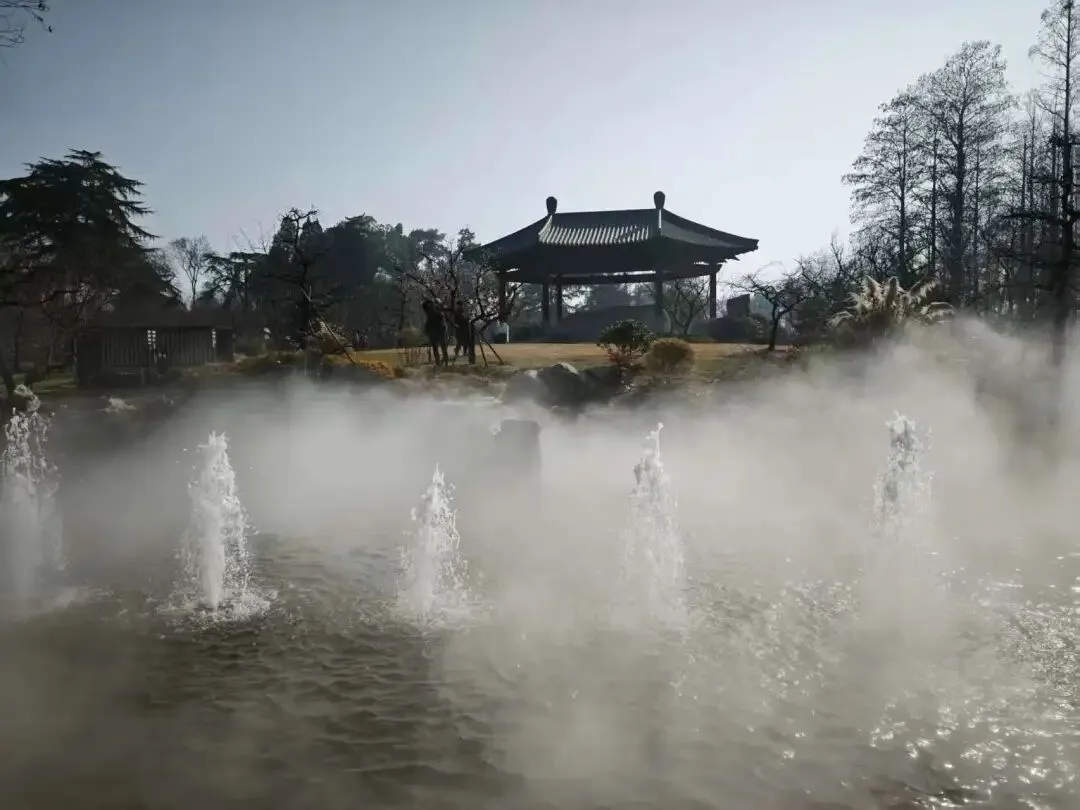 梅园“新十景”之一雾里探梅,方寸池水,依坡地叠石,植松种梅。这里巧妙地运用了人工水雾系统,每隔几分钟,池面便会烟雾缭绕。