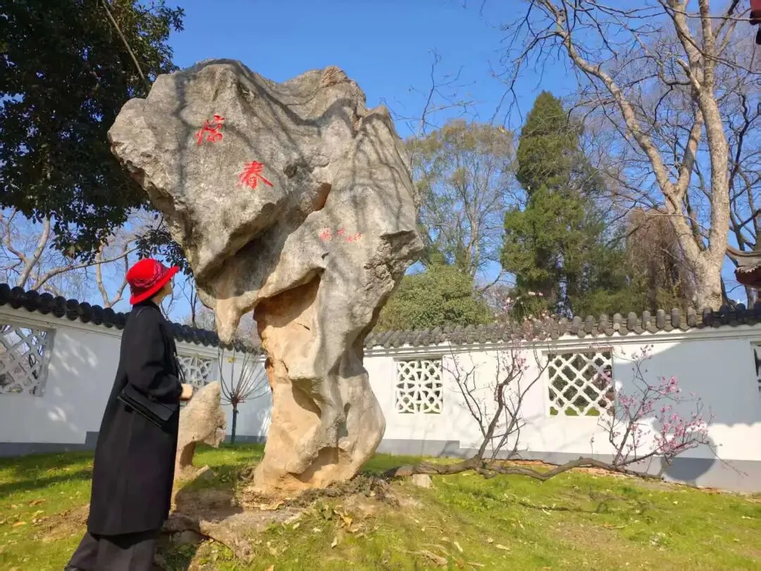 雾里探梅向上,同样是梅园“新十景”之一的今古咏梅,这里最大的特色在于“石”与“诗”的交融。景区内精心布置了多块形态各异的景观石,上面镌刻着历代文人墨客歌颂梅花的千古名句。相比于单纯的视觉赏花,这里更像是一座露天的“梅花诗词博物馆”,充满了浓厚的文化韵味。