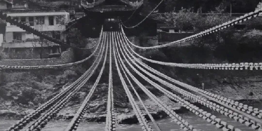 红军冒着枪林弹雨沿铁锁上匍匐前进,夺取了泸定桥~