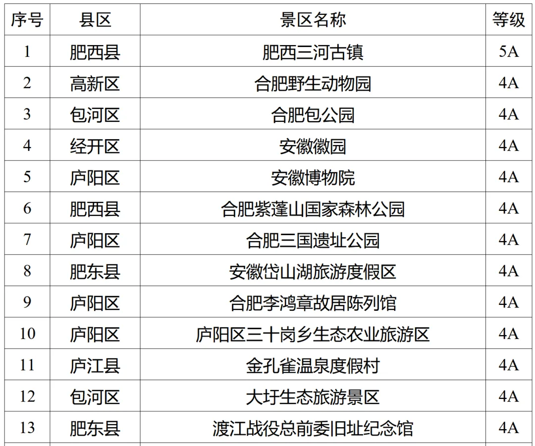 截至2025年5月,合肥市共有A级景区65家,5A级1家,4A级30家,3A级34家。