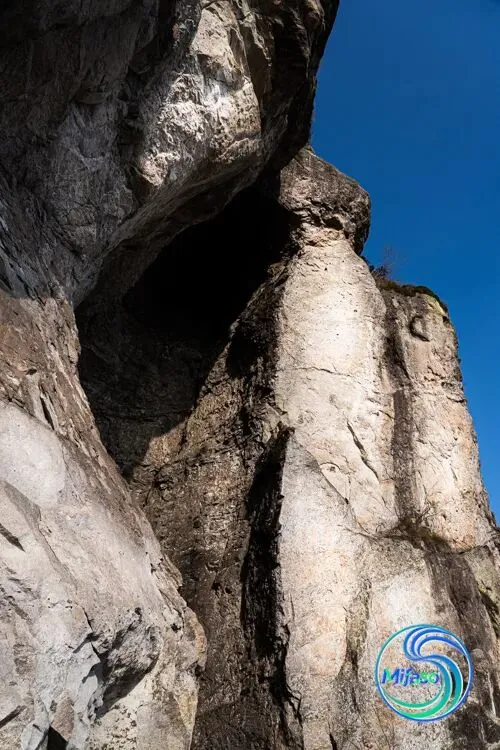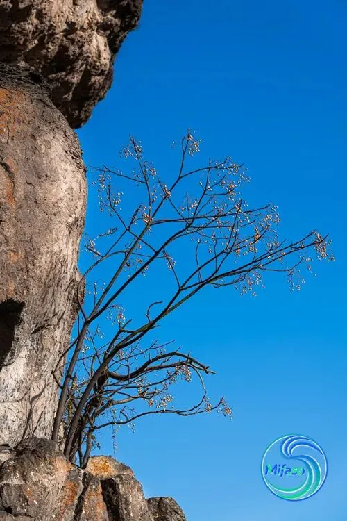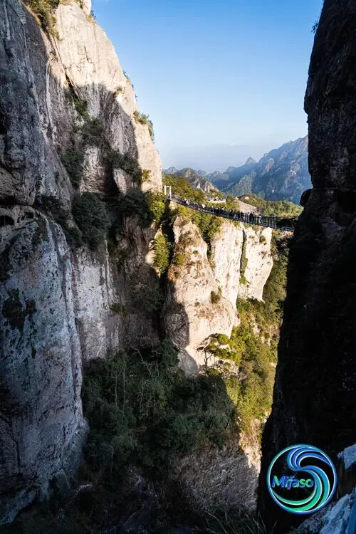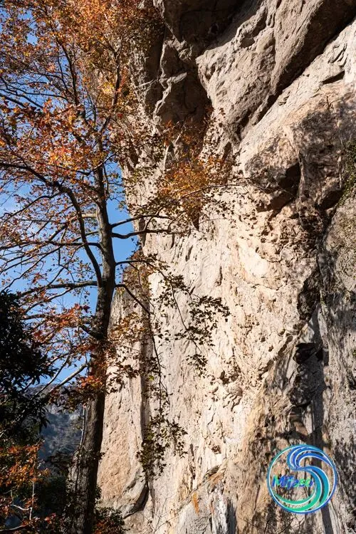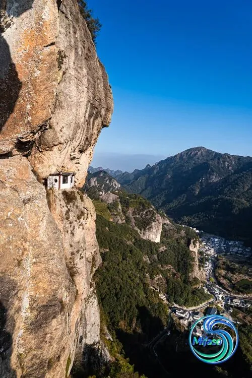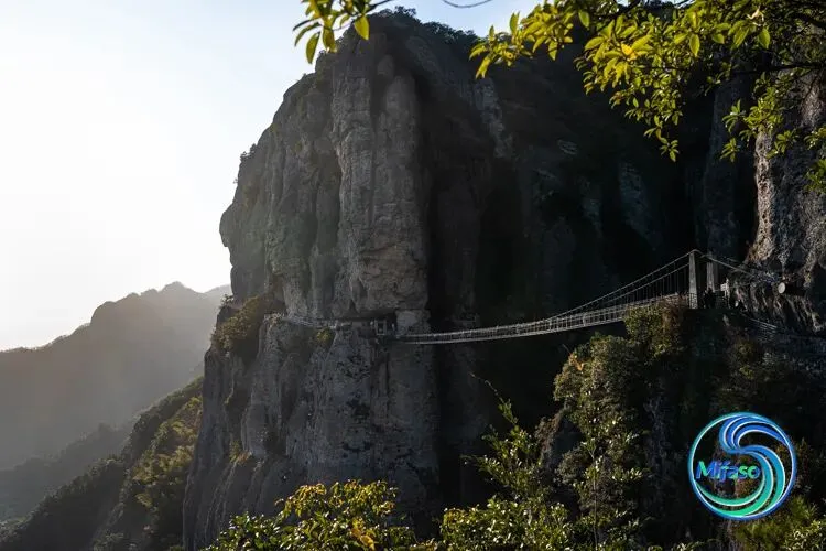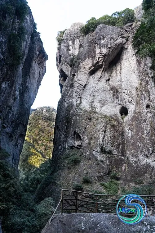 雁荡山方洞景区位于雁山路88号。方洞因方形的岩洞而得名,山岩耸而高。那时刚入冬,下午暖阳正好,红枫叶向风招摇着。从方洞景区游客入口进入,上台阶像登楼梯,不知不觉我们已到了半山腰。踏上方洞栈道,沿途经过“天根月窟”,北宋邵雍的诗有云:“乾遇巽时观月窟,地逢雷处见天根”蕴含哲学。来到竖直的岩石风化后的100多米高的金钟罩,酷似关刀而得名关刀洞是火山流纹岩天然洞穴。看了一些景观后,经过头顶不远就是岩石的崖边走道,到了山腰岩中驿站。从崖边栏杆往山下望去心生畏惧,顿感人的渺小,山下房屋已是火柴盒大小。看对面的岩石像风蛀岩石般流下一个个口子,感叹大自然的鬼斧神工。再往前走就是长100多米,离地高200多米的钢索桥了,走过去时并没想象的摇晃,蹑手蹑脚地通过。再往前走通过卧云栈道就到灵岩景区,形成环线游览线路。