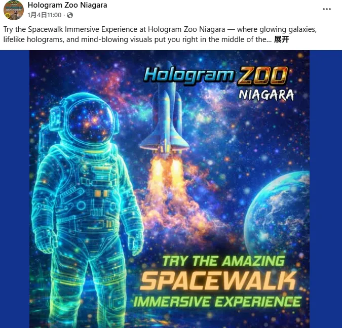 根据介绍,Hologram Zoo Niagara 采用先进的激光光影技术,让动物仿佛真的从屏幕中走出来,近在眼前却不失真实感。你可以在温暖的室内,轻松体验动物王国的奇妙魅力。