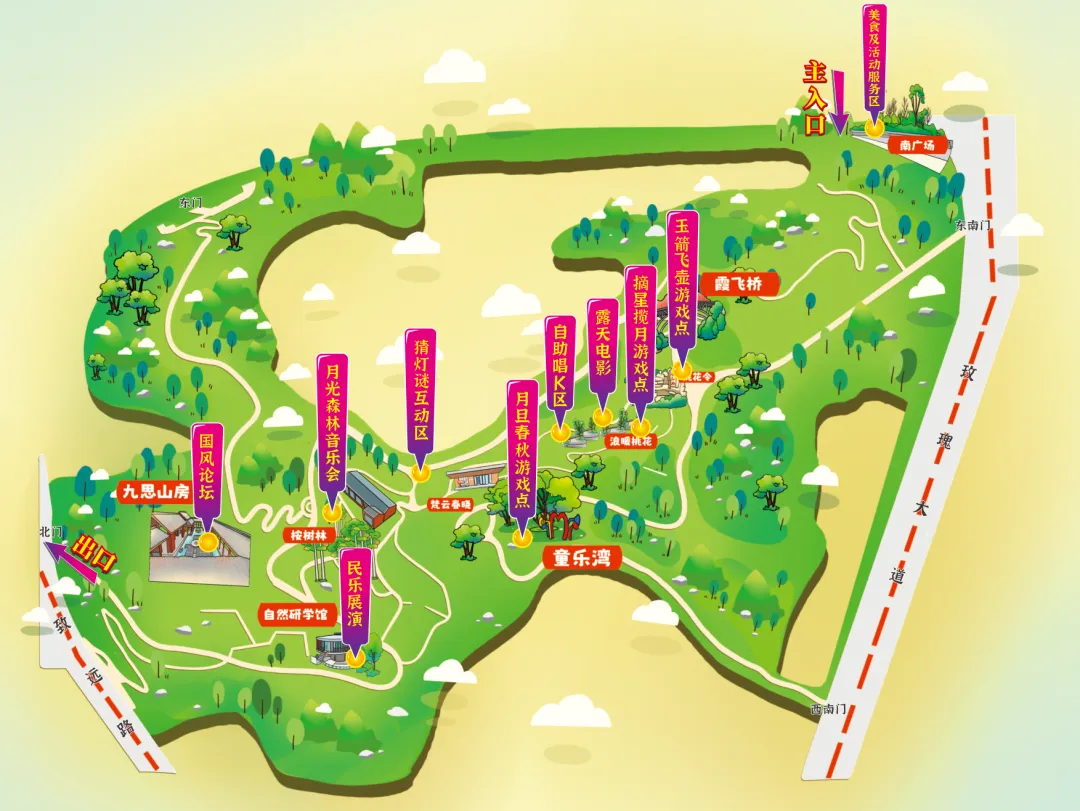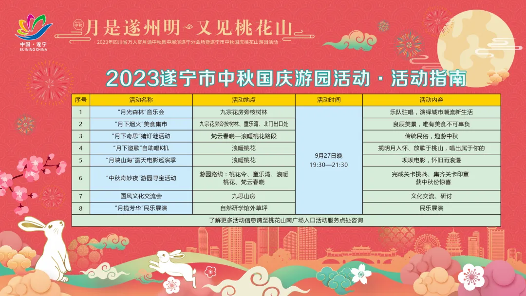 月是遂州明 又见桃花山 9月27日—10月5日 2023遂宁市中秋国庆游园活动 将在此开展 开园当天有民乐展演、非遗展、国风文化论坛 自助唱K等多项活动 活动指南看下图↓↓↓ 错过开园仪式的小伙伴也别担心 活动期间还有 音乐会、露天电影巡演、美食集市可以耍~ 戳地址直接开始导航