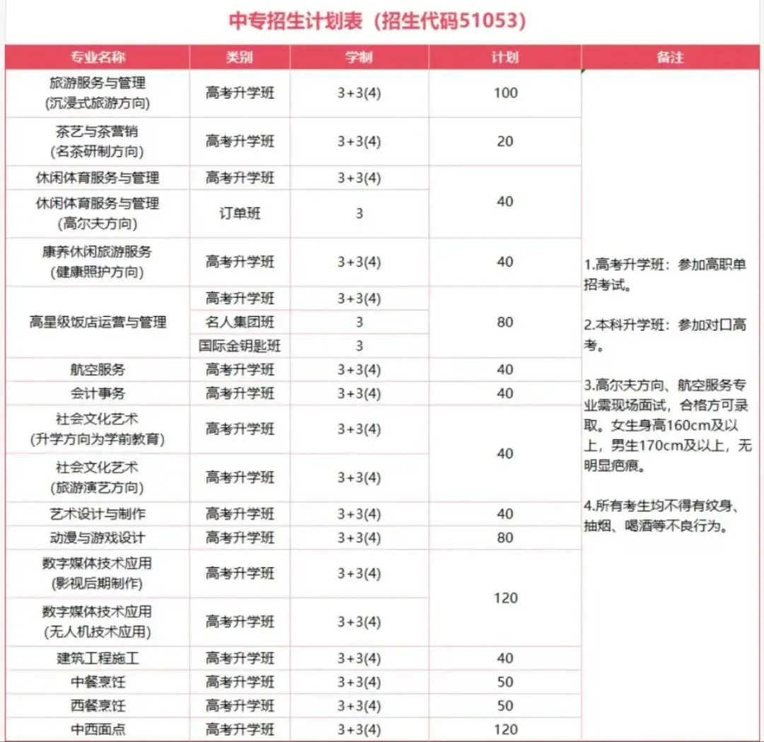 部分专业有特殊要求,如航空服务、高尔夫方向专业:女生身高160cm及以上,男生170cm及以上,无明显疤痕;