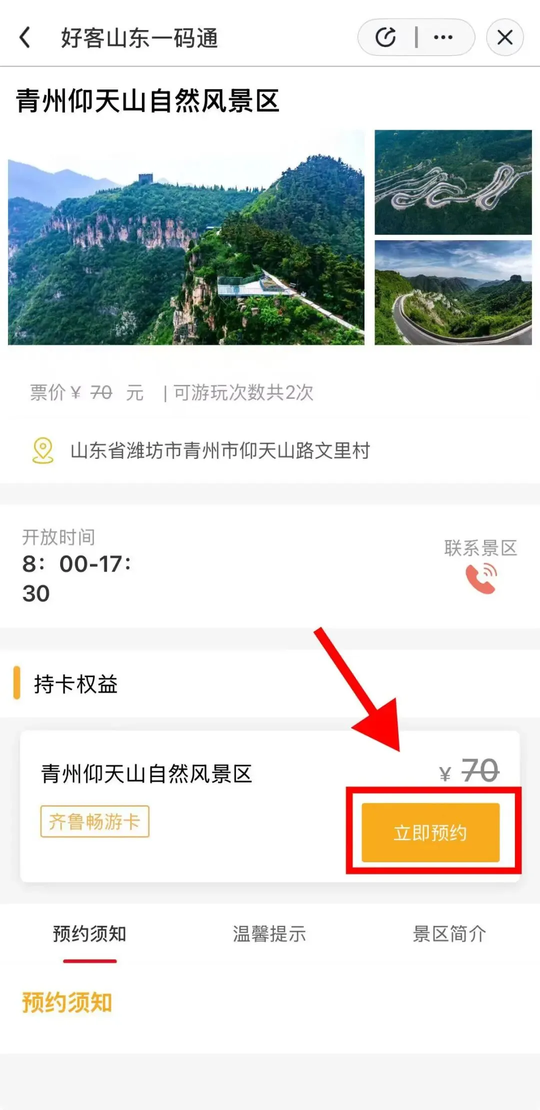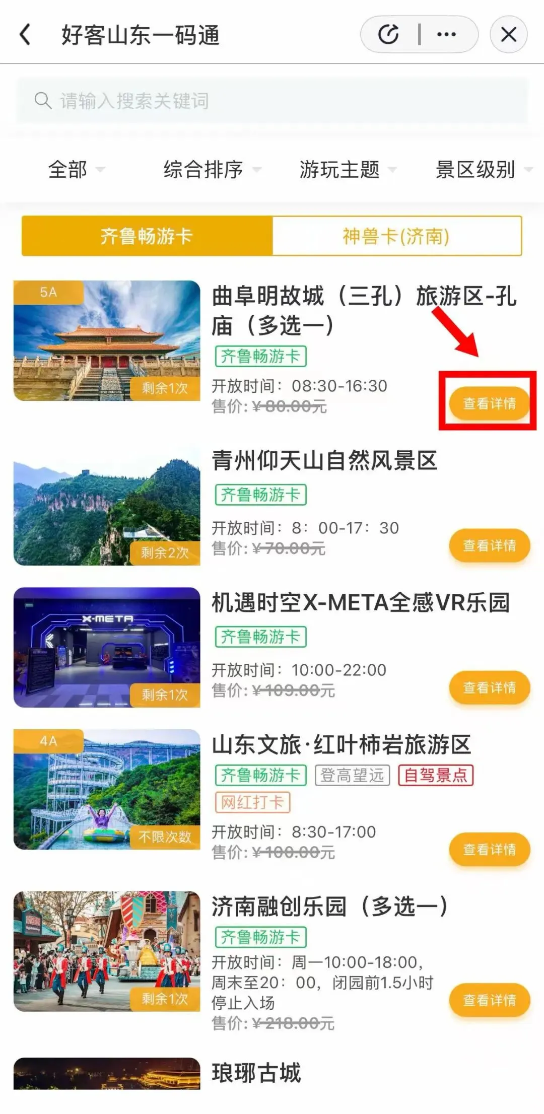 在已购买的“齐鲁畅游卡”项下,根据个人出行计划,选择需要预约的景区并点击进入;