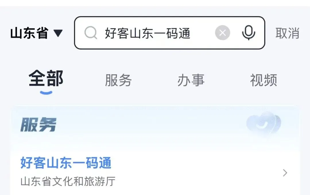 打开“爱山东”APP,首页搜索“好客山东一码通”,点击进入服务;