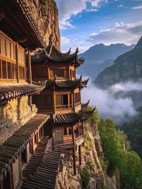 悬空寺位于恒山金龙峡西侧翠屏峰的峭壁间,是中国仅存的佛、道、儒三教合一的独特寺庙。整座寺院悬在半空中,被誉为"悬空寺,半天高,三根马尾空中吊"。