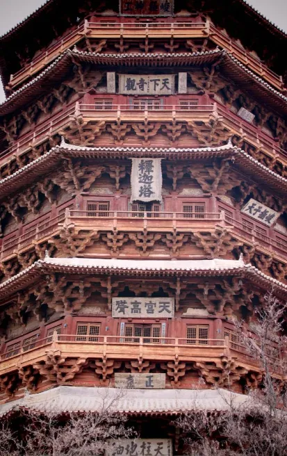 应县木塔全称"佛宫寺释迦塔",是中国现存最高最古老的纯木构建筑,被誉为"世界木构建筑之最"。塔高67.31米,底层直径30.27米。
