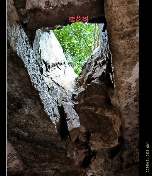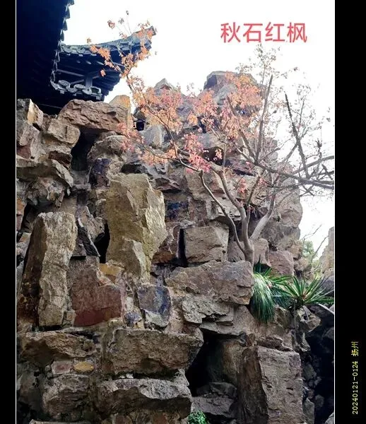 从夏景的假山区穿过,就到了秋景。秋山用粗犷的黄石叠成,其上还种有红枫。这个季节红枫的叶子本该落尽的,但秋末的突降的大雪使红叶触不及防的冻在了树枝上,所以还可以看到秋石红枫的景色。秋山下方有园主人纳凉的石洞,里面石桌石椅石榻具备,最妙的是石桌上方有一天然石窗,透过石窗可见一棵桂花树。“人闲桂花落”,真是妙哉。