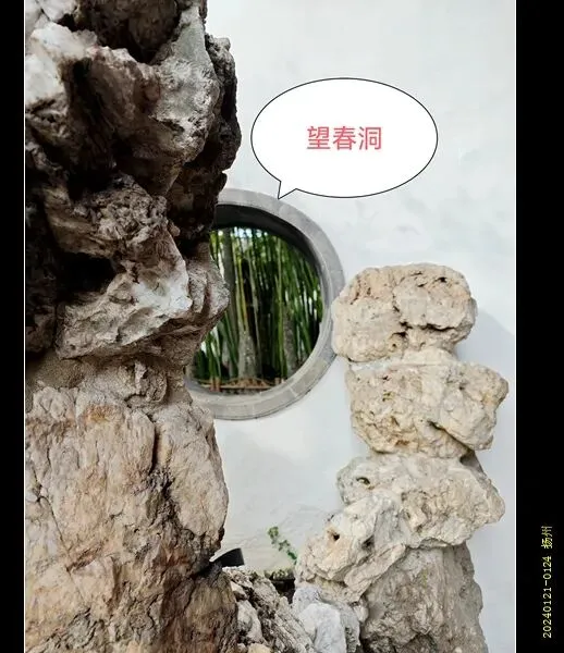 与冬景一墙之隔的是春景。墙上有一圆洞,正好能从冬看到春,所以叫做“望春洞”。春景用到的石头是石笋,形如“雨后春笋”之意,春景的路面是冰裂石,寓意冰雪消融,春意萌发。放眼望去,春园里是一派生机。