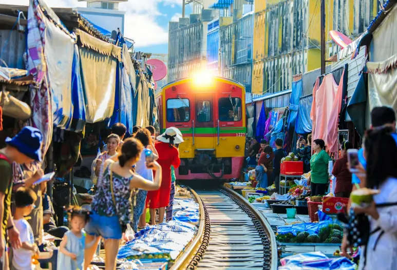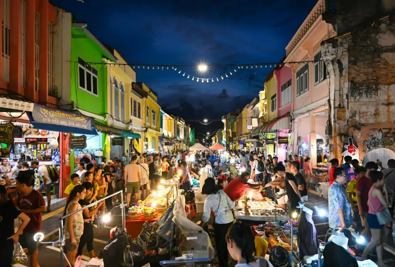 从曼谷出发,只需大约一个小时,您就能到达泰国最著名的水上市场,包括丹嫩沙多水上市场(清晨最为繁忙)和安帕瓦水上市场(更受当地人欢迎,夜生活氛围更浓厚)。 陆地上, 美功铁路市场 也别有一番风味:每天六次,众多商贩会收起部分摊位,让火车(缓慢地)通过。在 邦卡昭广袤的绿地上,您可以租一辆自行车,沿着水泥小路穿梭于荒野,越过藏匿着巨蜥的运河,最终抵达岛上独有的水上市场——邦南蓬水上市场。您甚至可以从曼谷出发,前往海滩享受海风和新鲜海鲜: 芭堤雅距离曼谷仅两小时车程。 泰国最大的岛屿 普吉岛 融合了福建、中国和马来西亚的文化元素,形成了 与泰国其他地区截然不同的独特文化。福建炒面、豆豉(一种用植物种子制成的果冻)、蚝煎(一种上面撒有猪皮的蚝煎)和五花肉(红烧肉)等美味佳肴都起源于普吉岛,即使在泰国其他地方也很难找到。 普吉岛的建筑见证了葡萄牙统治时期的历史,中葡风格的商铺——色彩、瓷砖和细节都独具特色——至今仍林立于老城区的街道两旁。再加上一流的海滩,您可以轻松地在普吉岛度过一周,尽情享受这里的一切。