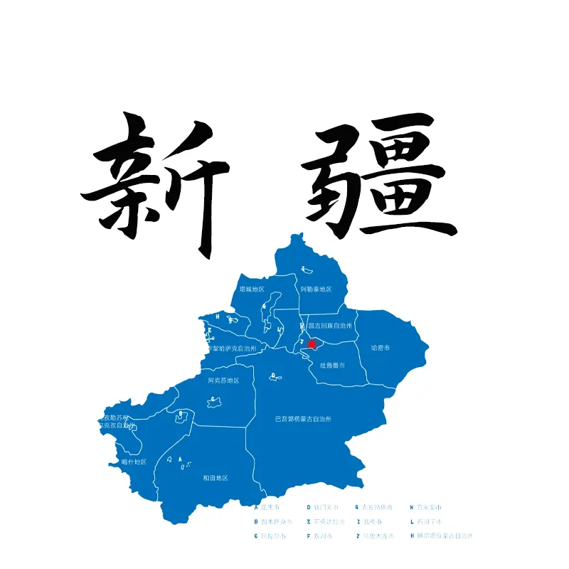 新疆维吾尔自治区,简称新,首府为乌鲁木齐市。位于中国西北部,亚欧大陆腹地,周边与俄罗斯、哈萨克斯坦、吉尔吉斯斯坦、塔吉克斯坦、巴基斯坦、蒙古、印度、阿富汗八国接壤,是中国陆地边境线最长、毗邻国家最多的省区。新疆地形轮廓鲜明,呈现 **“三山夹两盆”** 的独特格局,