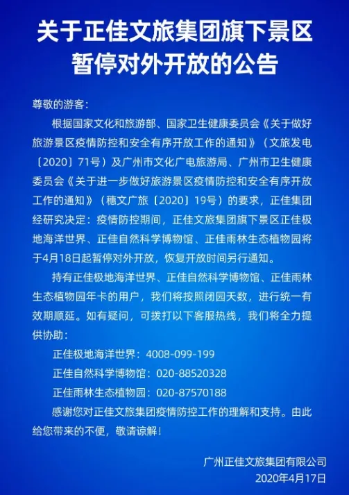 正佳集团昨晚宣布,正佳极地海洋世界、正佳自然科学博物馆、正佳雨林生态植物园将于4月18日起暂停对外开放,恢复时间另行通知。