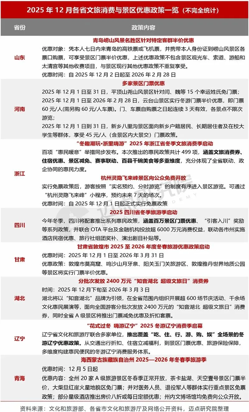 1.文旅景区促消费政策:浙江、四川、辽宁等多地推出“冬游消费季”优惠政策