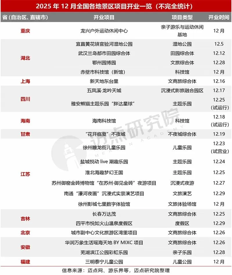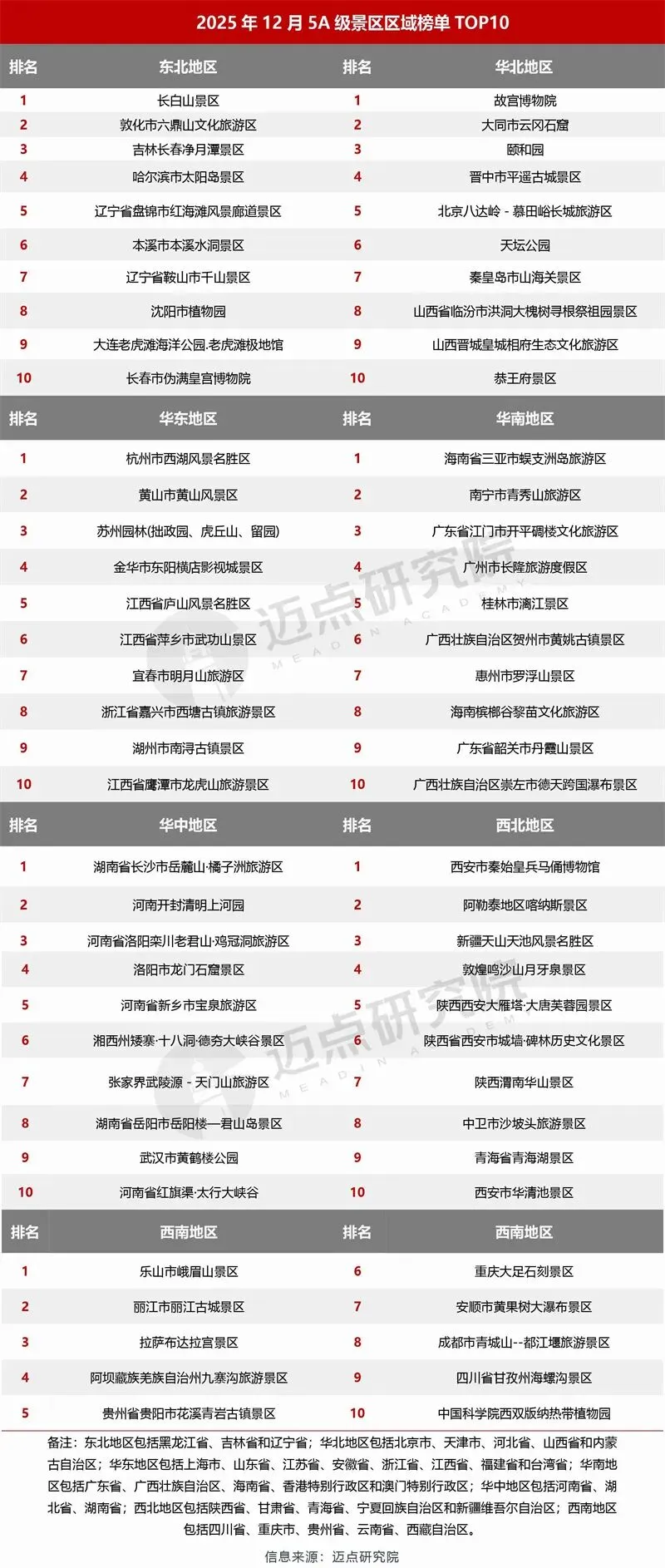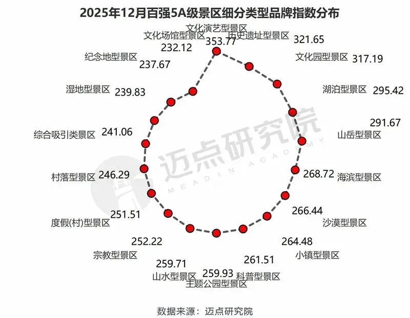 “2025年12月5A级景区品牌传播力100强榜单”数据来源于迈点品牌指数MBI,根据12月迈点品牌指数MBI的358家景区数据汇总统计而成。具体说明如下: