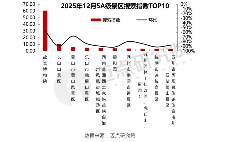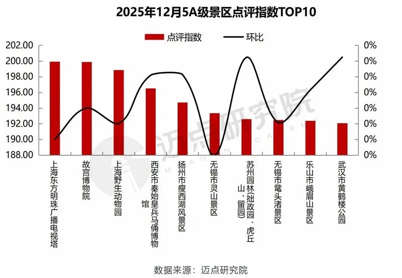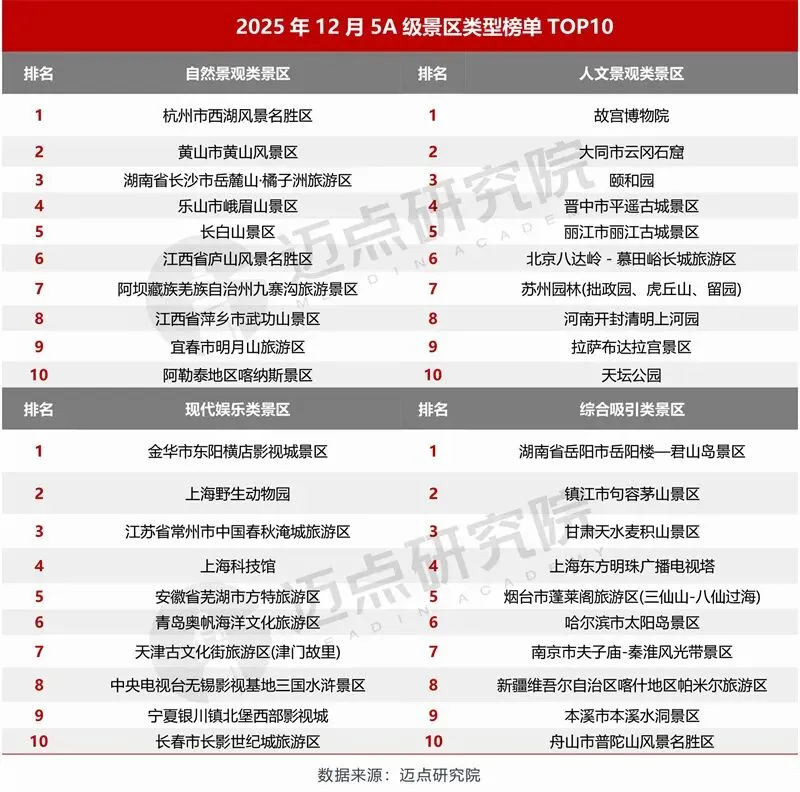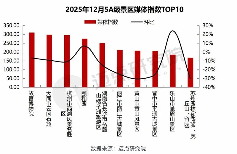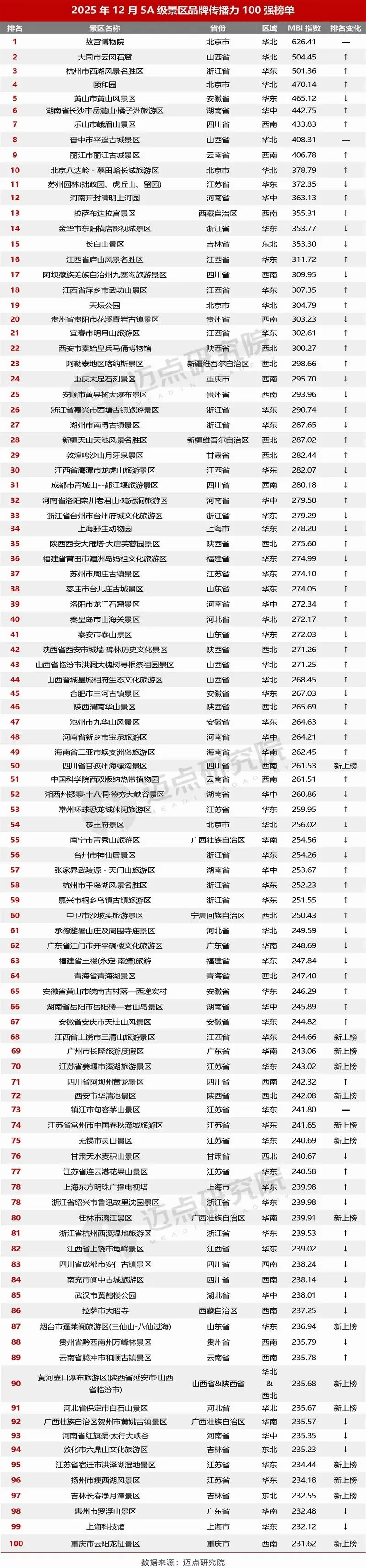 以下是迈点研究院独家发布“2025年12月5A级景区品牌传播力(MBI)100强榜单”。12月,故宫博物院、大同市云冈石窟、杭州市西湖风景名胜区、颐和园、黄山市黄山风景区、湖南省长沙市岳麓山·橘子洲旅游区、乐山市峨眉山景区、晋中市平遥古城景区、丽江市丽江古城景区、北京八达岭-慕田峪长城旅游区位列榜单前十。本月百强景区中,排名环比上升44家、下降38家、3家保持不变、15家新上榜。