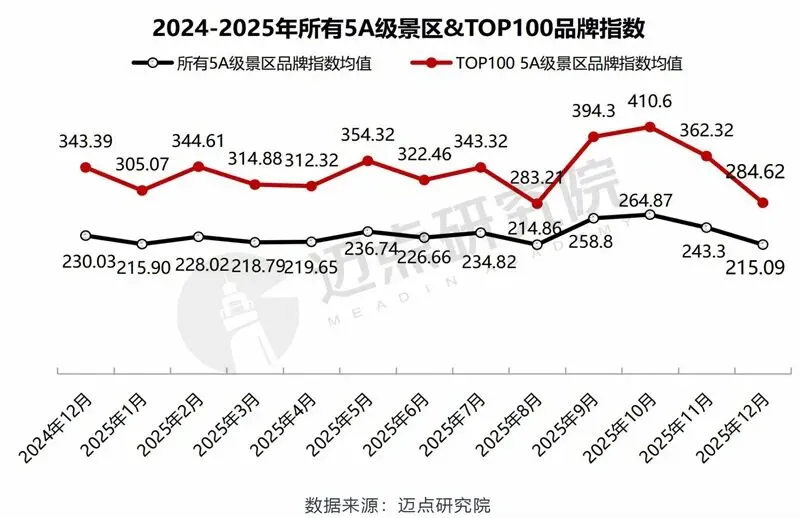 经迈点研究院监测,12月所有5A级景区的品牌指数均值为215.09,环比下降11.59%;100强5A级景区MBI品牌指数均值为284.62,环比下降约21%。12月处于传统的旅游淡季,游客出行意愿有所回落,叠加部分景区进入冬季运营调整期,品牌曝光与游客互动频次减少,使得5A级景区品牌指数呈现明显下滑,符合行业发展的周期性规律。
