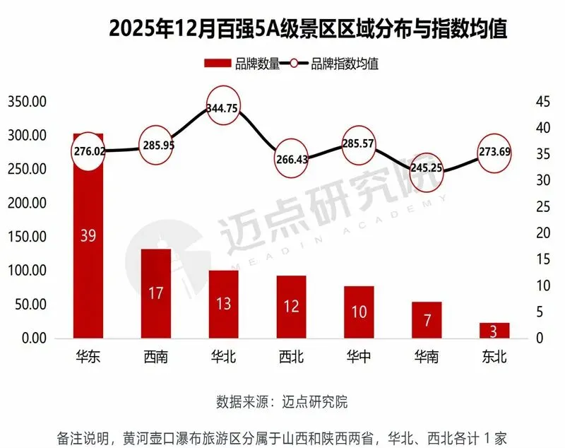 2025年12月,5A级景区百强品牌数量环比变动:华北增加2家、华南增加1家,西南减少2家,其余区域未变动。以华北地区为例,本月新上榜百强景区包括黄河壶口瀑布旅游区(山西省临汾市)、河北省保定市白石山景区2家,分别晋升51名和19名,尤其是黄河壶口瀑布旅游区排名上升明显,得益于“免门票优惠政策”、“冰瀑玉壶”观赏期来临等营销传播因素。