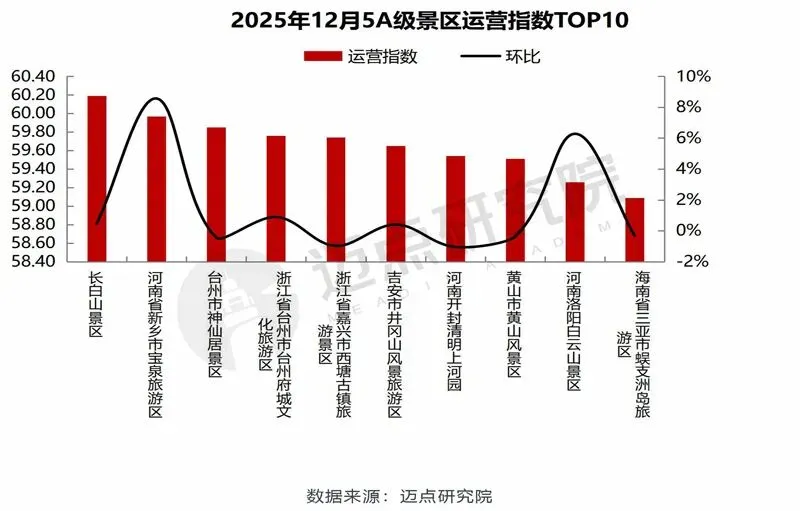 12月整体5A级景区品牌运营指数均值为17.93,环比上升1.47%;TOP1005A级景区品牌运营指数均值为30.91,环比增长8.68%。本月,5A级景区运营指数前十的分别是:长白山景区、河南省新乡市宝泉旅游区、台州市神仙居景区、浙江省台州市台州府城文化旅游区、浙江省嘉兴市西塘古镇旅游景区、吉安市井冈山风景旅游区、河南开封清明上河园、黄山市黄山风景区、河南洛阳白云山景区、海南省三亚市蜈支洲岛旅游区。其中,环比增幅相对较高的为河南省新乡市宝泉旅游区(运营指数环比提升约8%)。以抖音平台为例,宝泉旅游区荣登抖音“2025全国十大热门景区”,全平台发布条数11244条、登上抖音热榜31次、全平台传播量50亿次,强劲的线上传播势能与运营效能的协同发力,不仅推动景区热度持续攀升,更成为区域文旅IP打造与流量转化的典型范例。