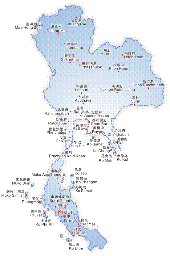 泰国,旧称为“暹罗”。首都曼谷,位于中南半岛中南部,东南临太平洋泰国湾,西南临印度洋缅甸海。西部及西北部与缅甸交界,东北部与老挝毗邻,东连柬埔寨,南接马来西亚。属热带季风气候,地势北高南低。总面积513000平方千米,海岸线2705千米,全国分为五个地区,共有77个府。泰国总人口为6790万人,全国共有30多个民族,泰族为主要民族,其余为老挝族、华族、马来族等。90%以上的民众信仰佛教,泰语为国语。