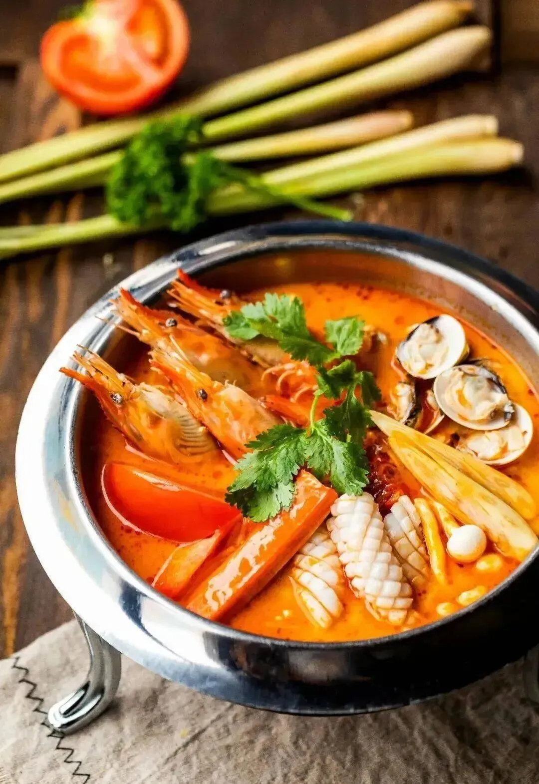 冬阴功汤,又叫东炎汤,冬荫功汤,是一道泰国名汤,典型的泰国菜,是世界十大名汤之一,在泰语中,“冬荫”指酸辣,“功”即是虾,合起来就是酸辣虾汤了。冬阴功汤的特点是采用泰国特有的柠檬叶、香茅、辣椒和虾制作而成,将辅料放入桶煲至出味,而后放入大头虾、鱼露、草菇、花奶、椰汁等一起炖煮,酸味鲜美开胃。冬阴功汤以色泽全红,汤味馥郁可口,辣度十足的为佳。