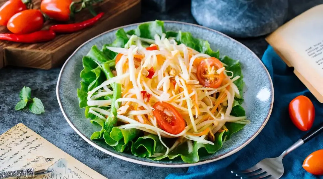 青木瓜沙拉,是泰国的特色美食,主料是青木瓜、柿子椒、蒜泥、红辣椒、鱼露、苹果醋、柠檬、盐等。做这道菜一定要选没有熟透的青木瓜,青木瓜与熟透的木瓜相比不仅口感清爽,而且营养更加丰富,含较多木瓜酵素,不仅可分解蛋白质、糖类,更可分解脂肪,加上木瓜酶助消化能力,能够尽快排出体内毒素,促进肌肤代谢,因此,青木瓜沙拉受到很多爱美人士的喜爱。