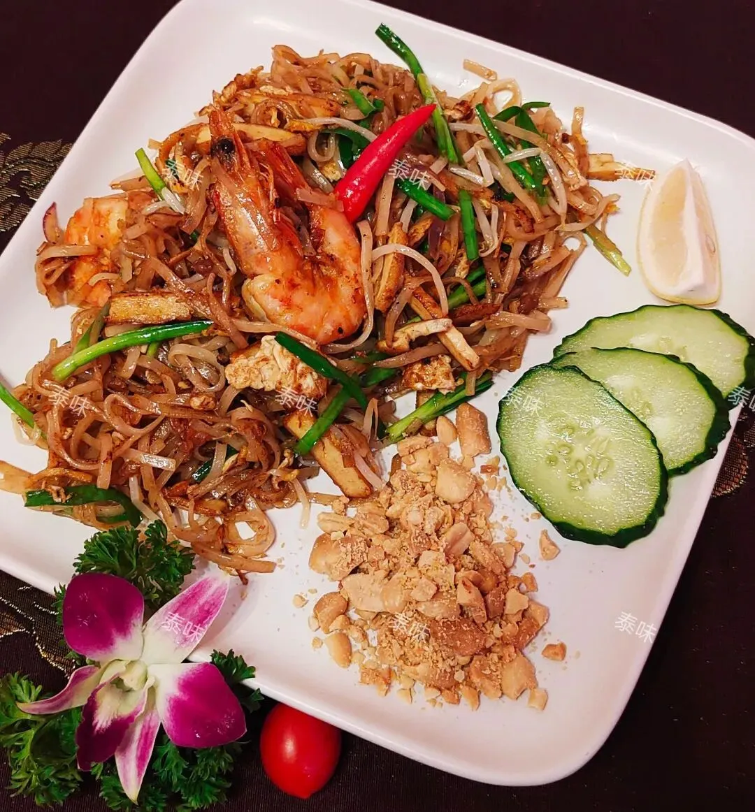 炒河粉,是比较有代表的泰国菜,也是泰国街头常见的美食,融合了咸、甜、酸、辣四种独特风味。泰式炒河粉的做法是河粉用温水泡软,豆腐干切小片,韭菜切段,花生放食品袋用刀背拍得碎碎的;鸡蛋打碎,用油炒熟,放下虾仁豆腐干绿豆芽翻炒,倒入河粉,淋老抽,小火炒至上色;加入2大勺的泰式甜辣酱,再加入韭菜和花生碎,转大火翻炒一下就可装盘。