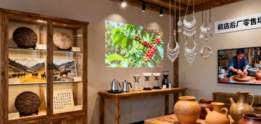 3. 植入“在地物产展”:前店后厂的零售场把民宿的大堂变成一个 “在地好物”的策展空间。 展示云南的普洱茶饼、手冲咖啡、民族银饰、非遗陶器。不同于土特产店的堆砌,我们要用博物馆的陈列方式,讲好每一个产品背后的故事。 当游客被故事打动时,购买就成了顺理成章的支持。这部分收入,往往能覆盖掉民宿的房租成本。